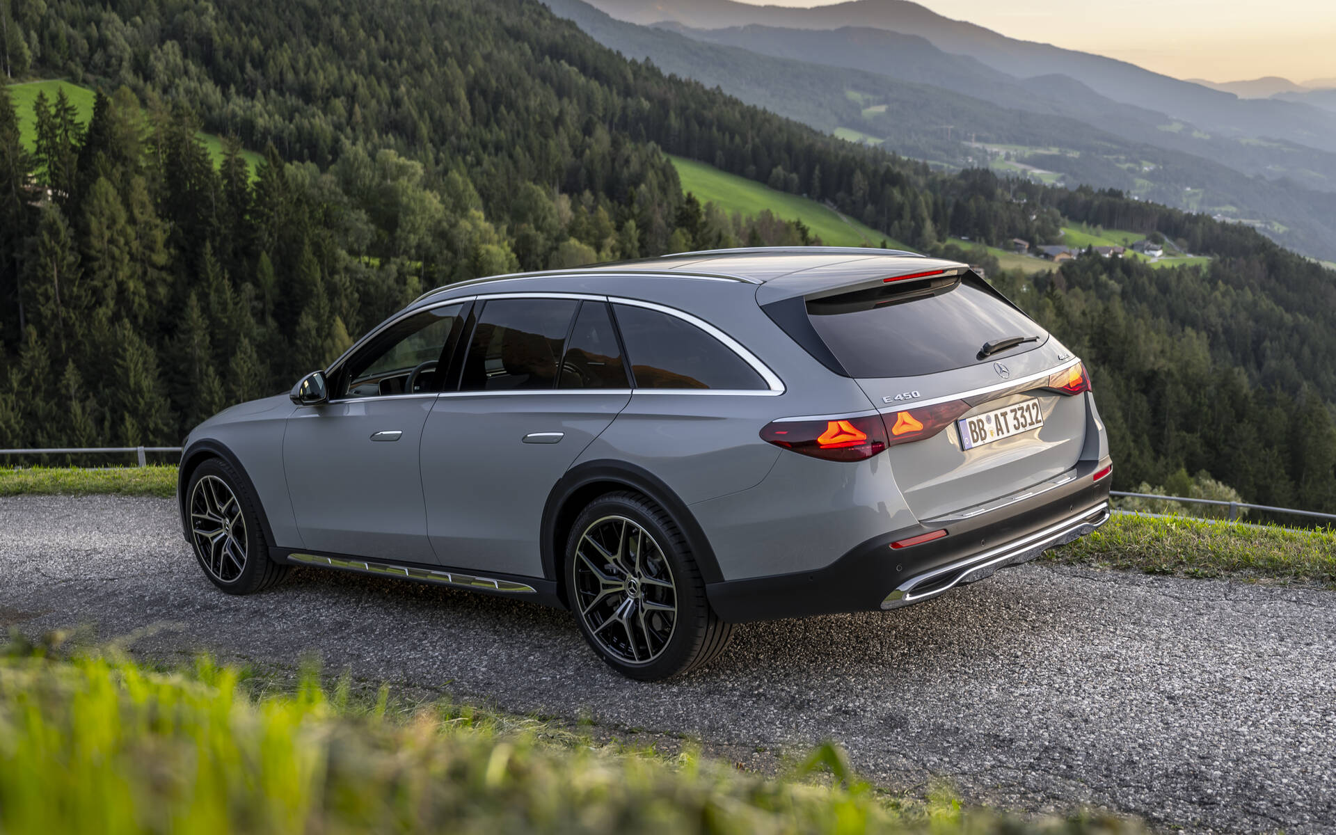 Cette variante possède également une allure plus robuste. Comparée à la berline de Classe E, elle est plus large (1 889 mm) et plus haute (1 497 mm), puis elle arbore une calandre unique, des pare-chocs spéciaux, des plaques protectrices (en chrome?) aux deux extrémités ainsi que des rebords d’ailes gris foncé qui surplombent des roues de 19 ou 20 pouces. Le hayon à commande assistée découvre un coffre de 615 litres qui s’agrandit à 1 830 litres en repliant les dossiers des sièges de la deuxième rangée (40/20/40).