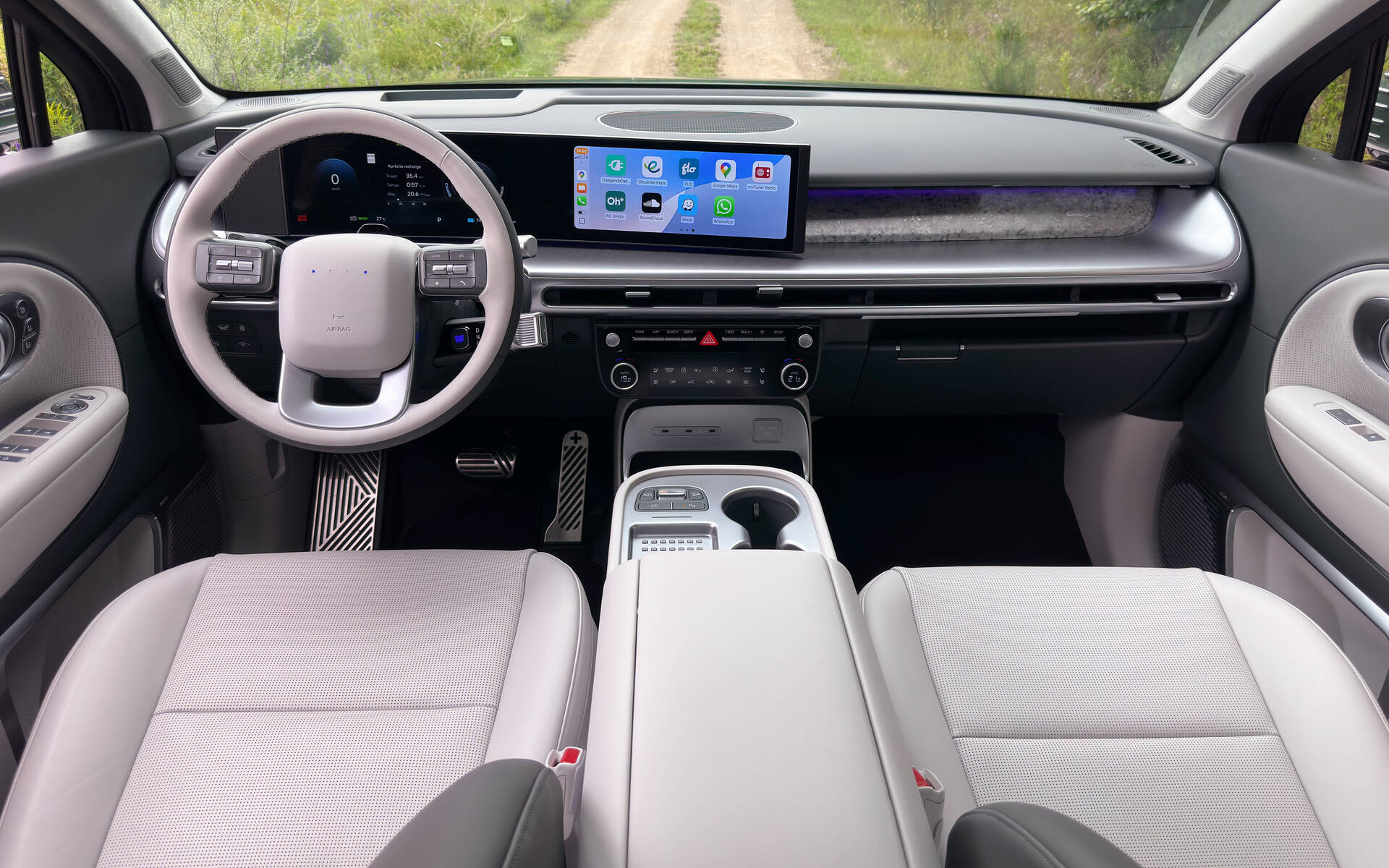 L’habitacle de l’Ioniq 9 c’est la classe aux trois rangées. D’abord à l’avant, où de grands écrans clairs et nets font bon ménage avec une kyrielle de commandes physiques bien placées. Le système multimédia est rapide et bien structuré, mais on se lasse de passer de la projection CarPlay (ou Android) au système embarqué pour certains réglages. Il y a une abondance de rangements à l’avant et une console que l’on peut déplacer sur 19 cm. De la deuxième rangée, on accède à son grand tiroir en plus de régler la climatisation arrière et d’activer le chauffage ou la ventilation des sièges.