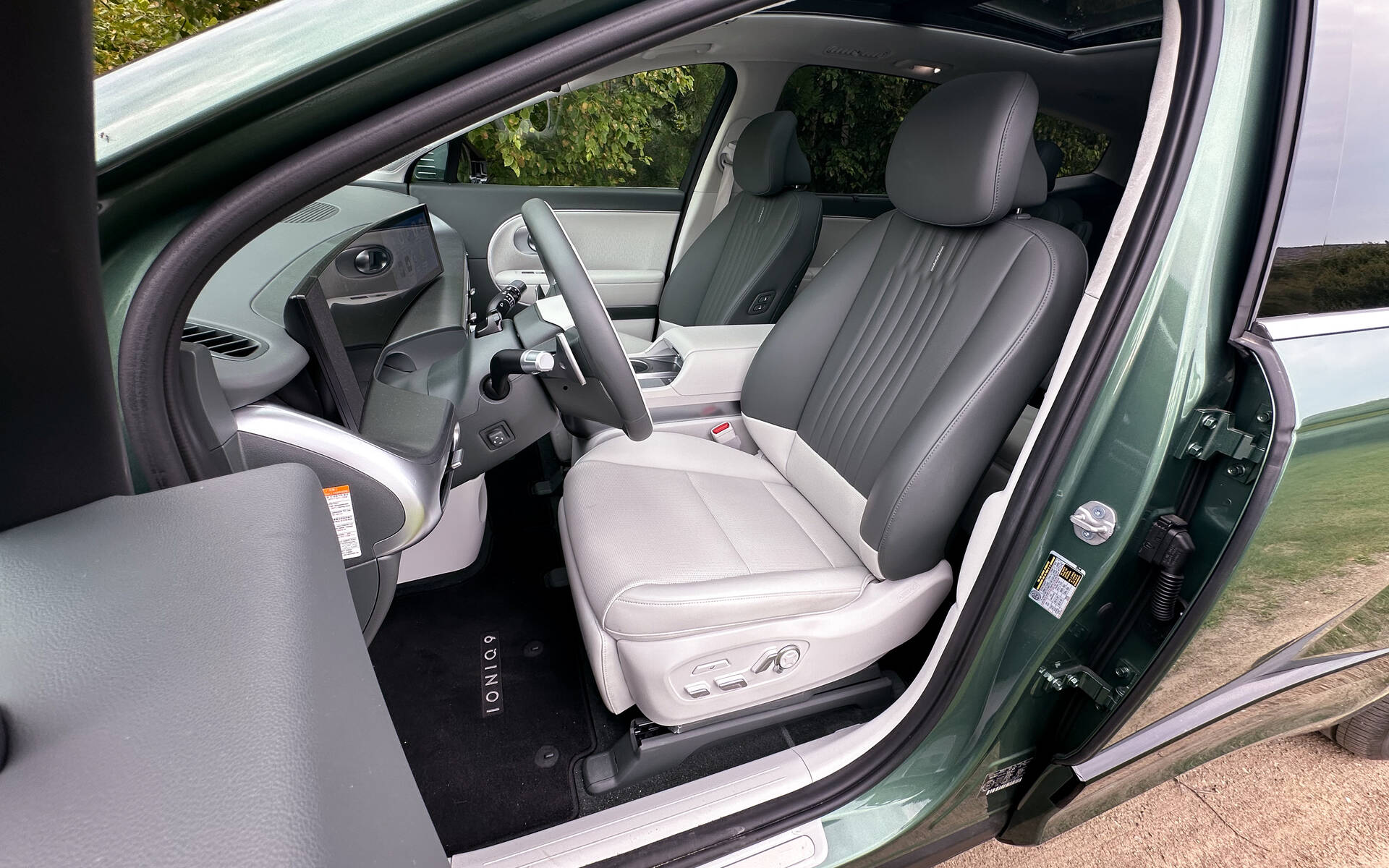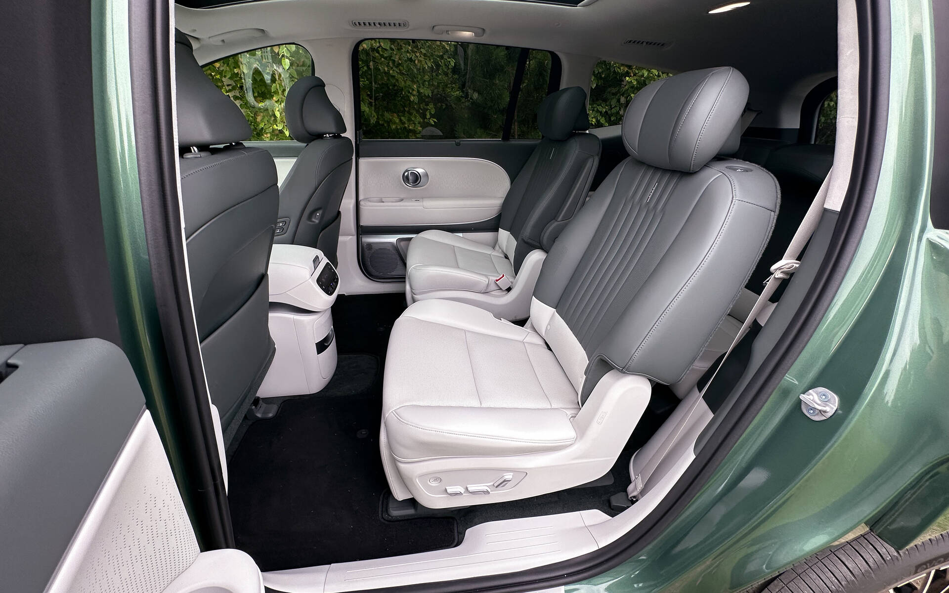 Hyundai a plutôt choisi de nous confier un Ioniq 9 doté du groupe Calligraphy, le plus cher de tous à 84 640 $. On le reconnaît à ses faces avant et arrière exclusives, ses moulures foncées ou monochromes et ses roues de 21 pouces. Cette option de 16 500 $ métamorphose pratiquement l’Ioniq 9 en limousine en le meublant de sièges individuels à la deuxième rangée. Des fauteuils chauffants et ventilés dont la base s’allonge et le dossier s’incline pour les transformer en répliques assez fidèles du La-Z-Boy de mon père. Ils lui valent évidemment six places au lieu des sept que comptent les autres versions.