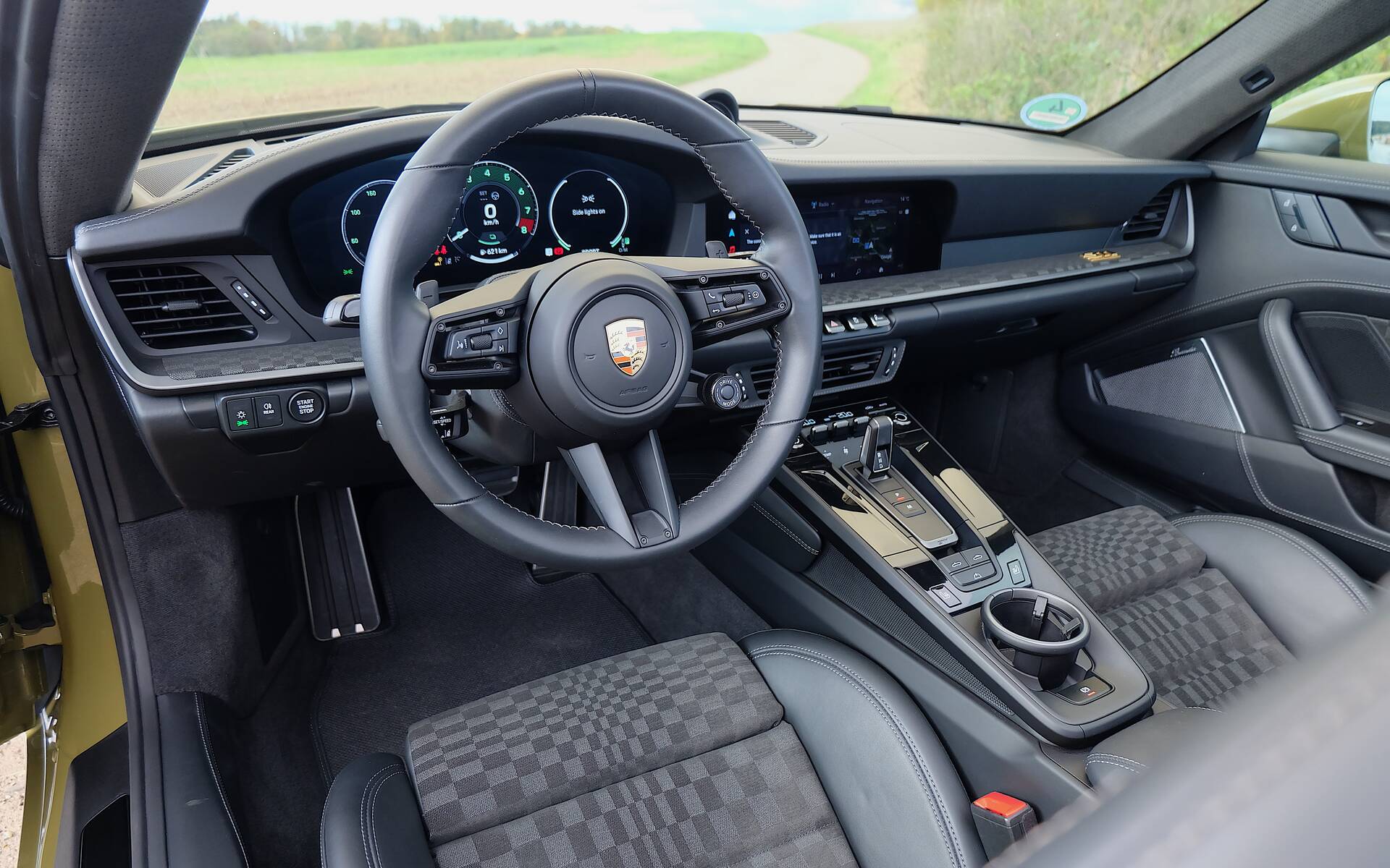 Dans l’habitacle, on retrouve évidemment le même souci du détail que dans les autres 911. Il y a tout de même quelques différences, notamment une instrumentation et une montre de couleur verte inspirées des Porsche 356. Mais aussi un tissu à motif « Pasha » avec des carreaux de différente grosseur, qui a d’ailleurs été inauguré sur la Porsche 928.
