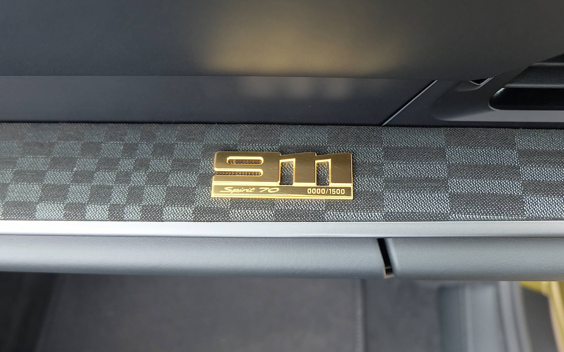 Enfin, une plaque dorée avec le nom du modèle fait face au passager. Elle indique que seuls 1 500 exemplaires seront produits dans le monde…et que notre modèle d’essai porte le numéro 0000. Cela signifie qu’il s’agit du modèle qui sera conservé par Porsche et qui intègrera la collection du constructeur et peut-être le musée dans quelques années.