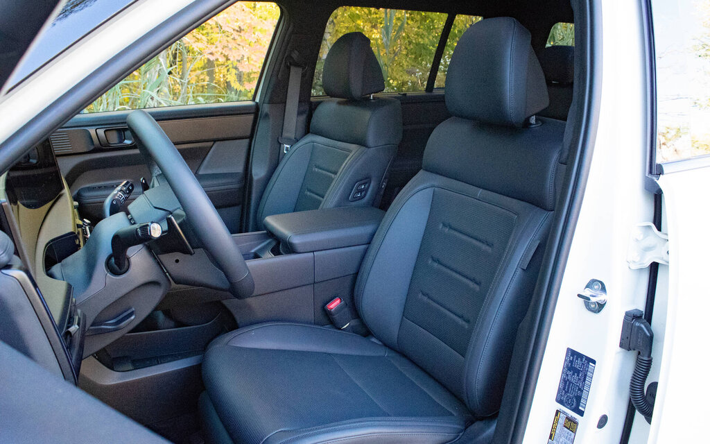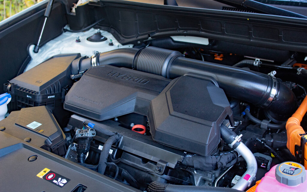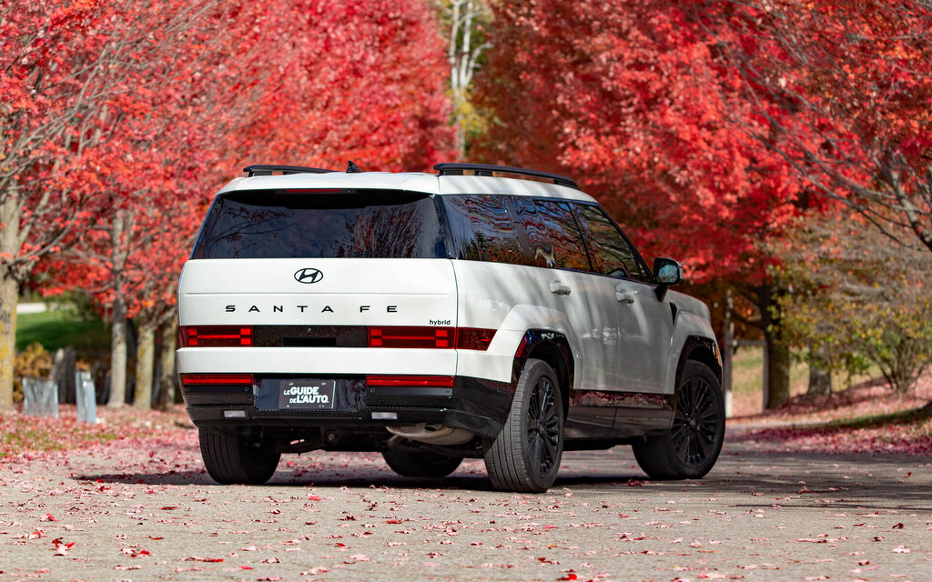 Le Santa Fe hybride combine un 4 cylindres de 1,6 litre turbocompressé de 178 chevaux avec un moteur électrique de 59 chevaux. Ensemble, ils produisent une puissance maximale de 231 chevaux et un couple de 271 lb-pi. Le tout est acheminé aux quatre roues par une transmission à 6 rapports. En revanche, sachez que la capacité de remorquage de 2 000 lb est inférieure aux 3 500 lb des modèles à essence sortants. Vu le gabarit et le poids (2 075 kg), il s’agit d’un duo franchement intéressant sur le plan des performances et de la consommation. D’abord parce que la boîte exploite adéquatement la cavalerie, bien que le moteur s’avère bruyant lorsqu’il est sollicité.
