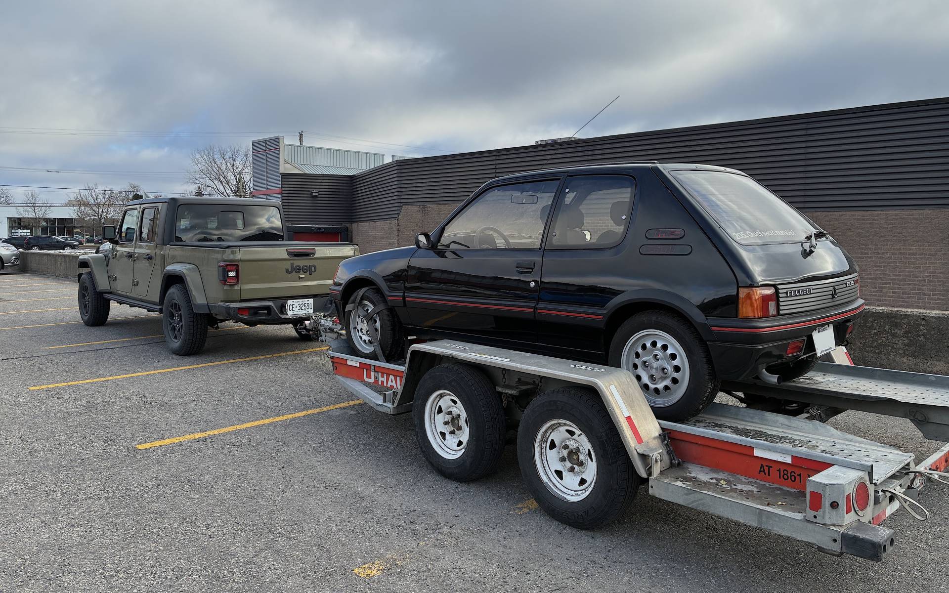 Problème, l’hiver est arrivé vraiment tôt cette année, avec un épais tapis blanc recouvrant la route dès le début du mois de novembre. Il m’a donc fallu penser à un plan B pour que ma fidèle Peugeot 205 GTI se rende au remisage sans poser ses roues dans le sel et la neige.