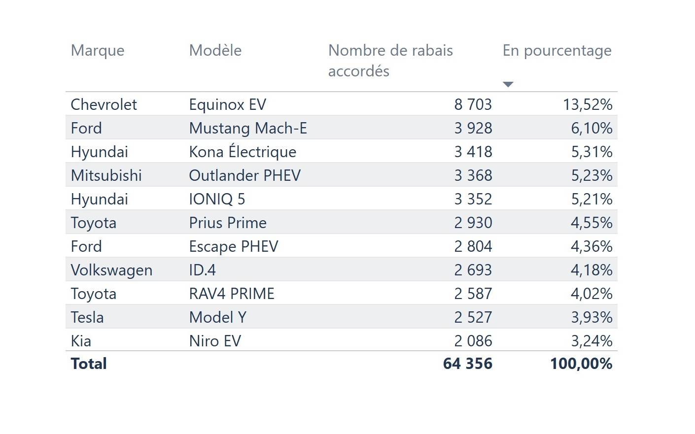 Le Chevrolet Equinox EV trône au sommet, loin devant le Ford Mustang Mach-E, pour lequel il existe d’énormes rabais du fabricant. Le Hyundai Kona électrique devance son grand frère, l’IONIQ 5, les deux étant séparés par le Mitsubishi Outlander PHEV, qui a été le modèle hybride rechargeable le plus subventionné en 2025.