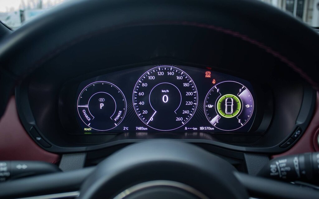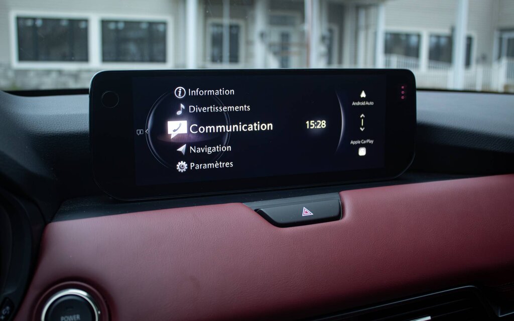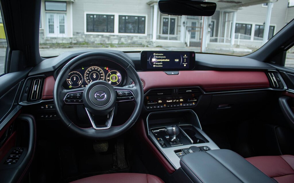 L’environnement du CX-70 se caractérise par une qualité de finition et d’assemblage irréprochable. L’esthétique est épurée et l’ensemble des commandes est centralisé, maximisant l’ergonomie. Or, c’est un peu moins le cas pour le système multimédia de 12,3 pouces — tactile pour 2026 —, où il faut apprivoiser le fonctionnement de la molette sur la console. À l’inverse, le combiné d'instrumentation numérique de 7 pouces face au conducteur arbore une interface magnifique et simple à utiliser.