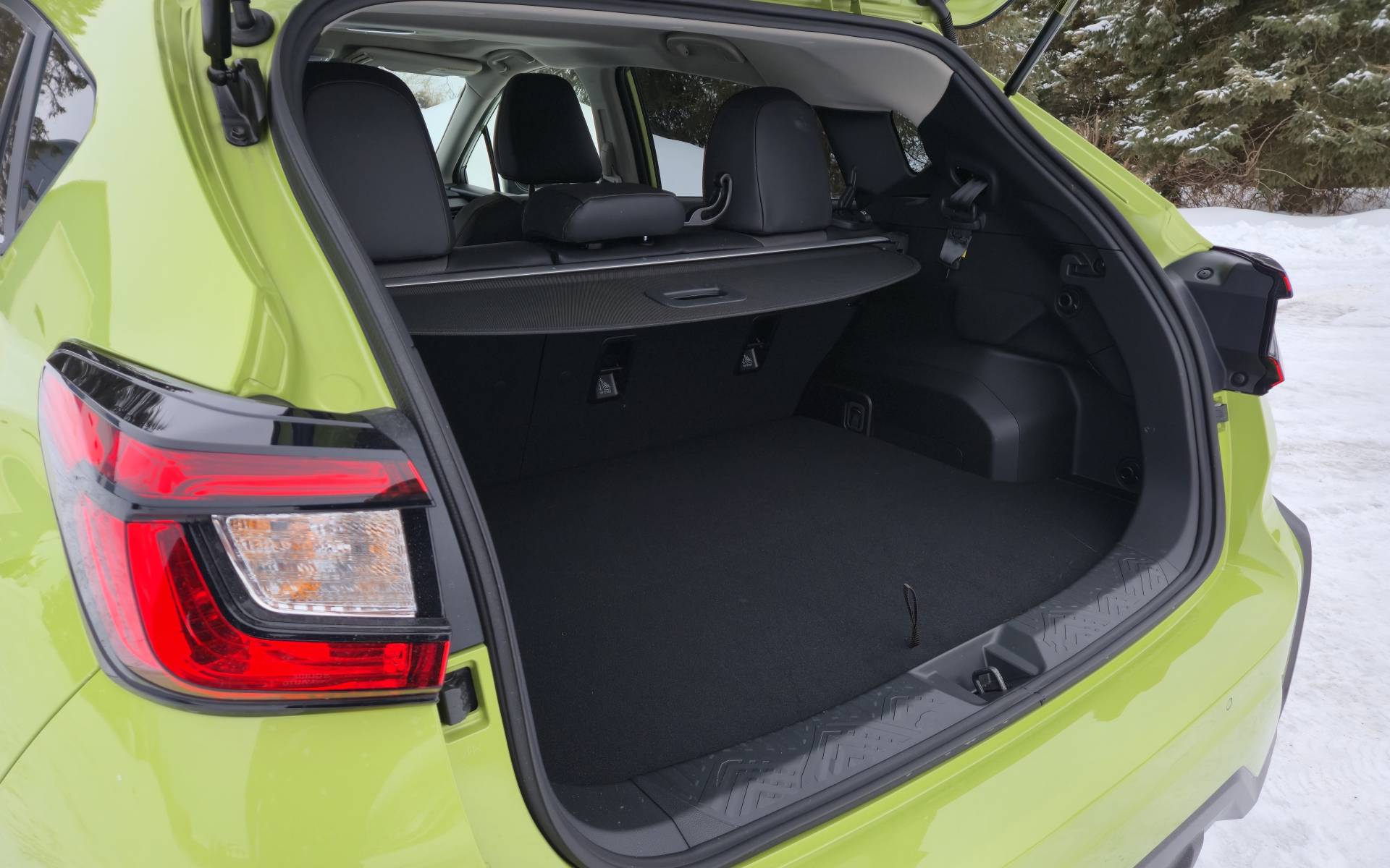 Pour le reste, ce sont essentiellement les mêmes commodités et caractéristiques que l’on note chez les autres Crosstrek, y compris la bonne position de conduite, les sièges confortables et juste assez enveloppants, le réservoir d’essence de 63 L, la capacité de remorquage de 1 500 lb et la garde au sol de 220 mm. Le dégagement pour les jambes aux deux rangées est appréciable, hélas pas celui pour les bagages. Déjà l’un des plus compacts de la catégorie, le coffre rétrécit de 564 à 527 L en raison de la batterie du système hybride (de 1 549 à 1 433 L avec la banquette repliée). Un autre utilitaire aurait certes été préférable pour transporter toutes ces boîtes du Guide de l’auto 2026 à notre kiosque du Salon de l’auto de Montréal!