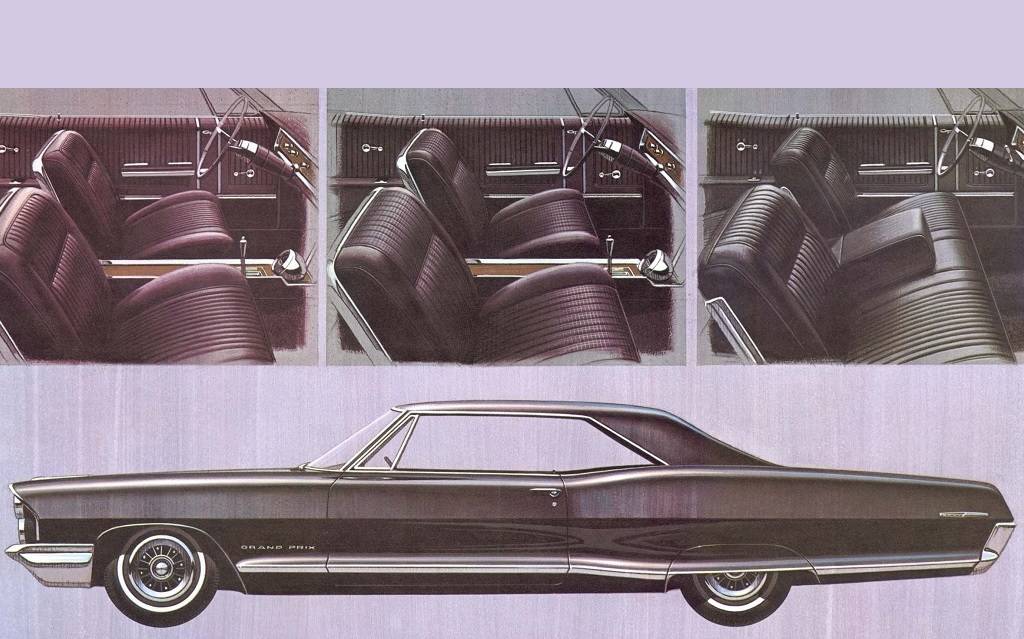 À l’intérieur, une banquette simple peut, pour la première fois, être commandée et un mélange tissu/Morrokide est également disponible. La jauge de vacuum n’est plus proposée. Pour 3 426 USD, l’équipement de série comprend la boîte de vitesses manuelle à 3 rapports, le compte-tours, l’horloge électrique, l’échappement double et des lampes de courtoisie. La liste d’équipements optionnels est aussi longue que précédemment. Pontiac n’y va pas avec le dos de la main morte et présente la Grand Prix 1965 comme « le coupé sport le plus époustouflant du monde ».