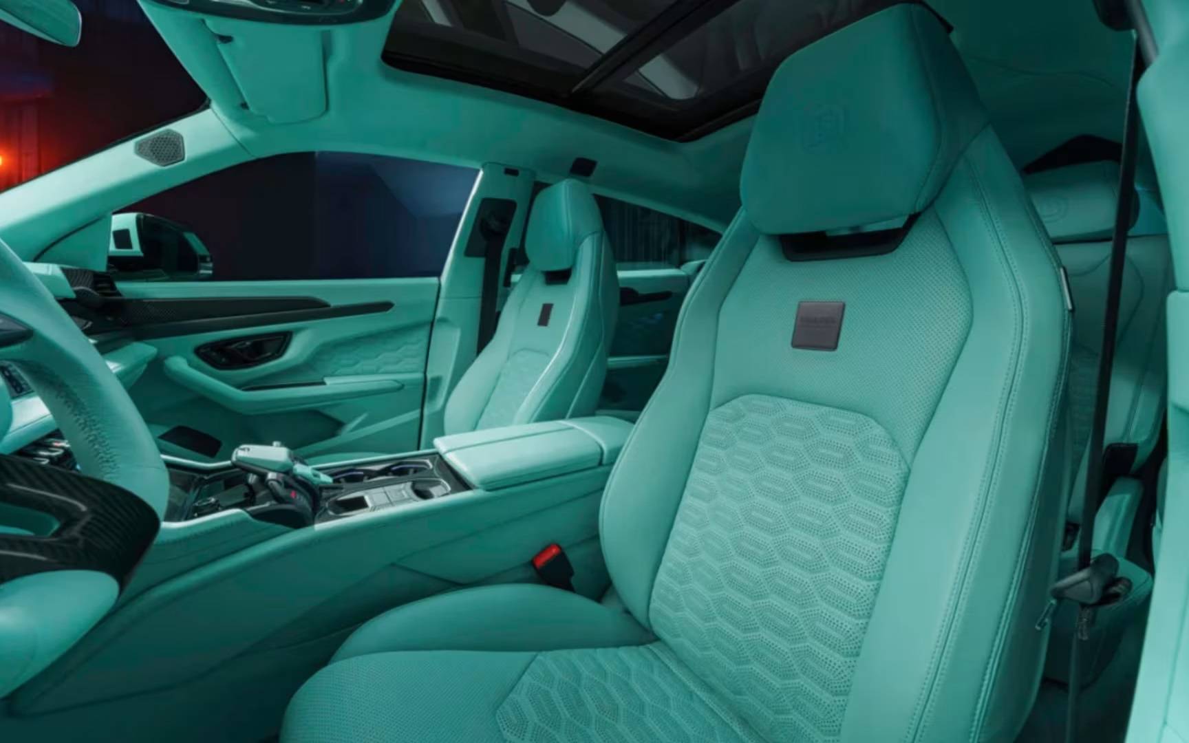 Pour ce qui est de l’habitacle, tel que mentionné plus tôt, la couleur menthe est à l’honneur là aussi, allant des sièges à la planche de bord en passant par le volant, les portières et les tapis. C’est définitivement plus clair à bord que dans un Urus SE, mais les occupants pourraient s’en tanner assez rapidement. Pas vous? Au moins, il reste un peu de fibre de carbone exposée et de l’aluminium ici et là.