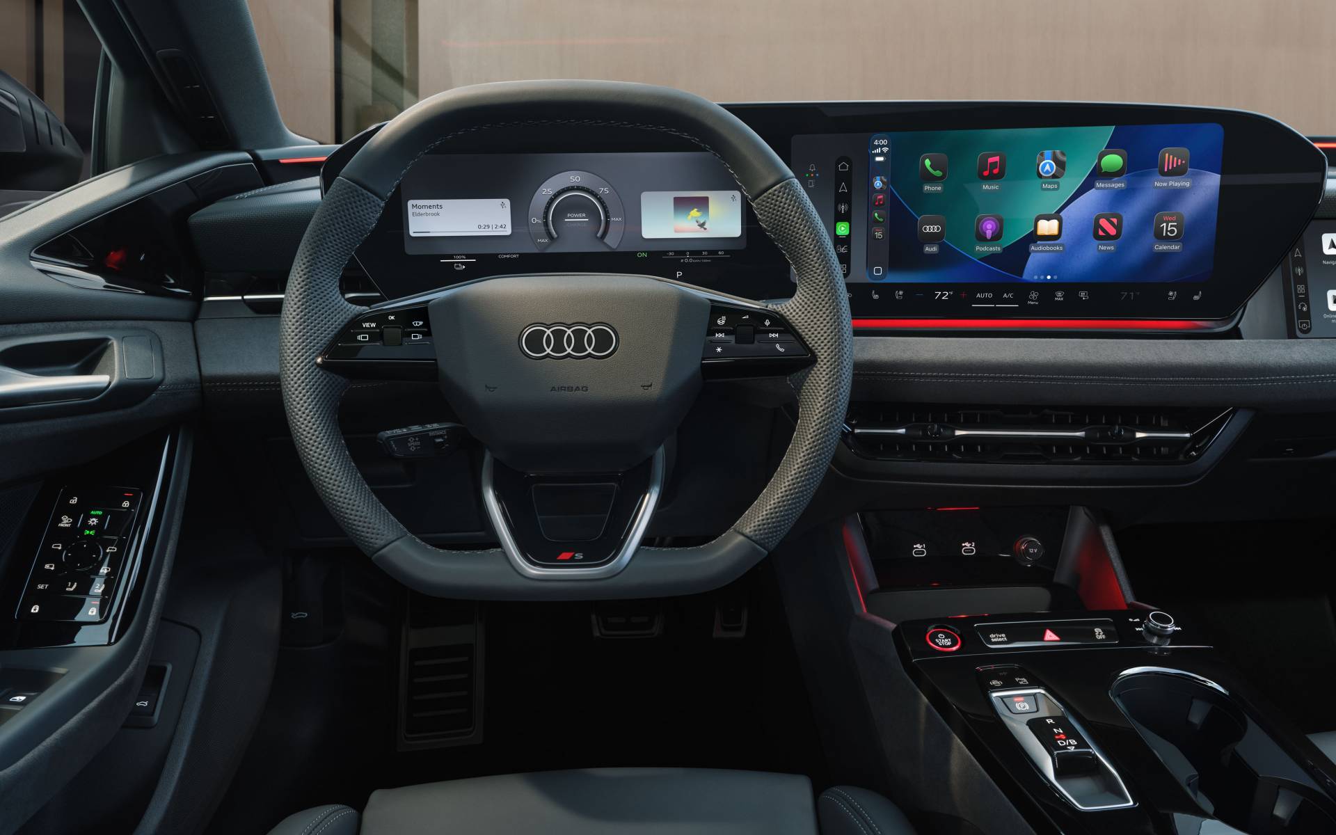 Devant le conducteur, le tableau de bord numérique a lui aussi été épuré et simplifié pour une utilisation plus conviviale. Trois affichages uniques peuvent être sélectionnés à l’aide du bouton « View » sur le volant. Audi a amélioré au passage l’intégration des fonctions du téléphone qui est jumelé au véhicule. En outre, deux roulettes de sélection s’ajoutent sur le volant pour remplacer des commandes tactiles