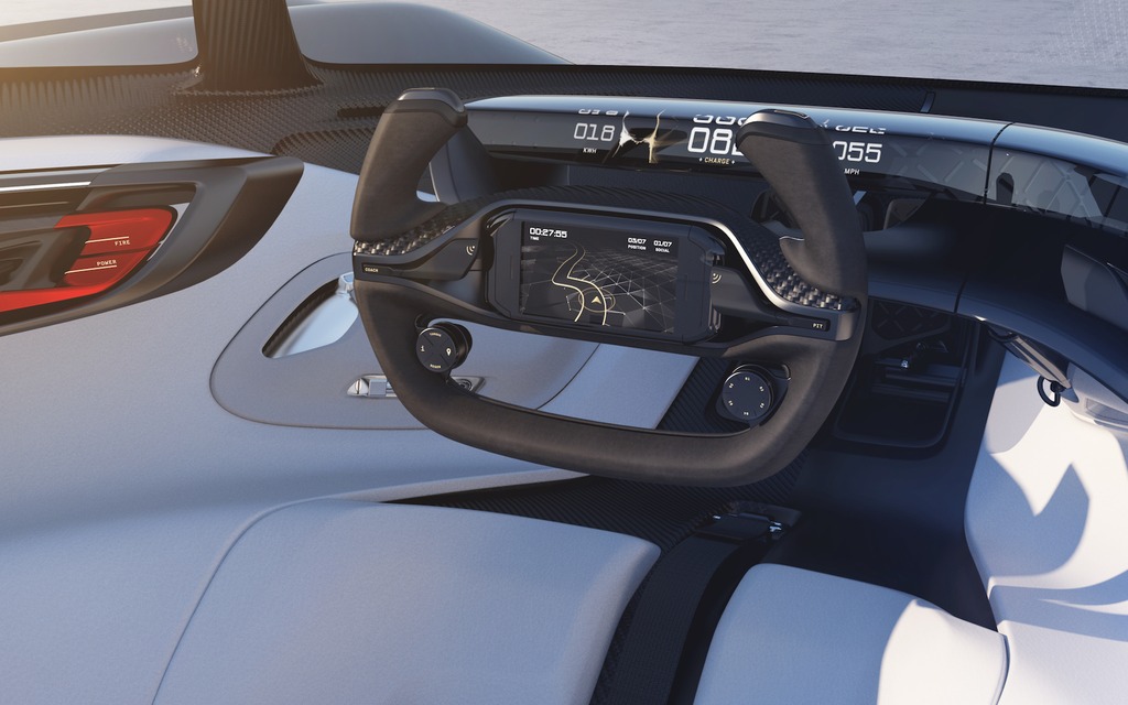 Why redesign something that already exists? At the heart of the car’s management is an iPhone with a dedicated application. The phone is literally integrated to the steering wheel. This single-seater sports car, which seems to have been developed for the 24 Hours of Le Mans race, also includes a specially designed helmet that incorporates a HANS safety device as well as a water and oxygen system for the pilot.
