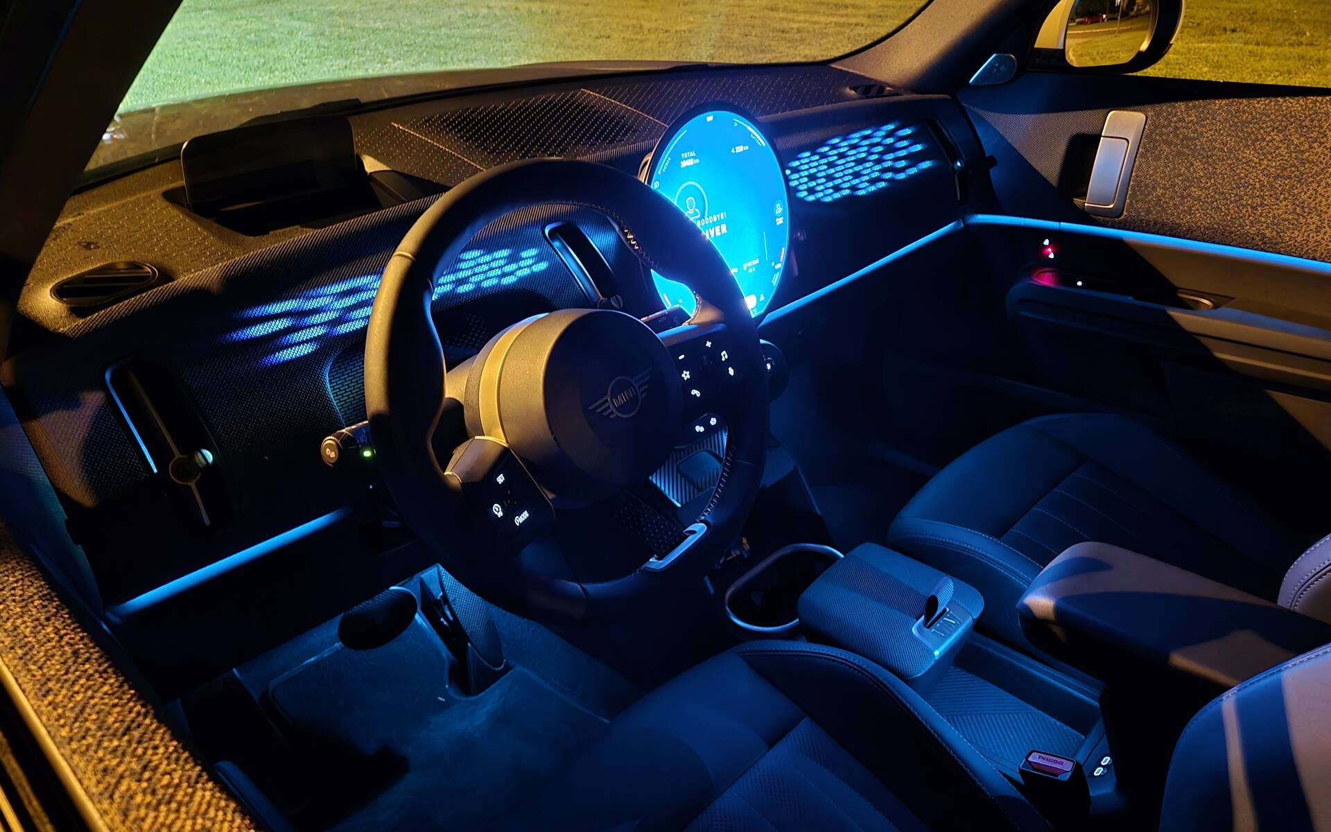 Inside, under the panoramic roof, the major transformation of the new MINIs is no less impressive, even more so at night with ambient lighting that varies according to the MINI Experience modes and extends into the mesh fabric of the dashboard. Real leather is nowhere to be found, but all the materials are refined and solidly assembled—even the fabric strip that replaces one of the steering wheel spokes.