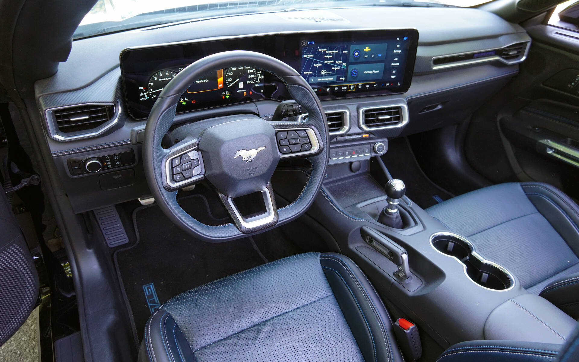 Other visual cues include a GT/CS badge within the rear "GT" emblem, black-and-blue side decals, black-painted headlight bezels, as well as a unique grille design without the traditional Mustang emblem. Inside, the California spirit continues with Navy Blue upholstery and blue-and-white contrast stitching.