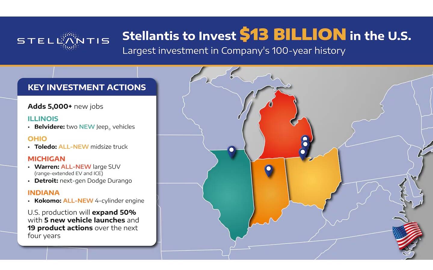 Stellantis will invest $13 billion over the next four years—the largest single investment in the company’s 100-year U.S. history—to increase its domestic manufacturing footprint and create more than 5,000 jobs.