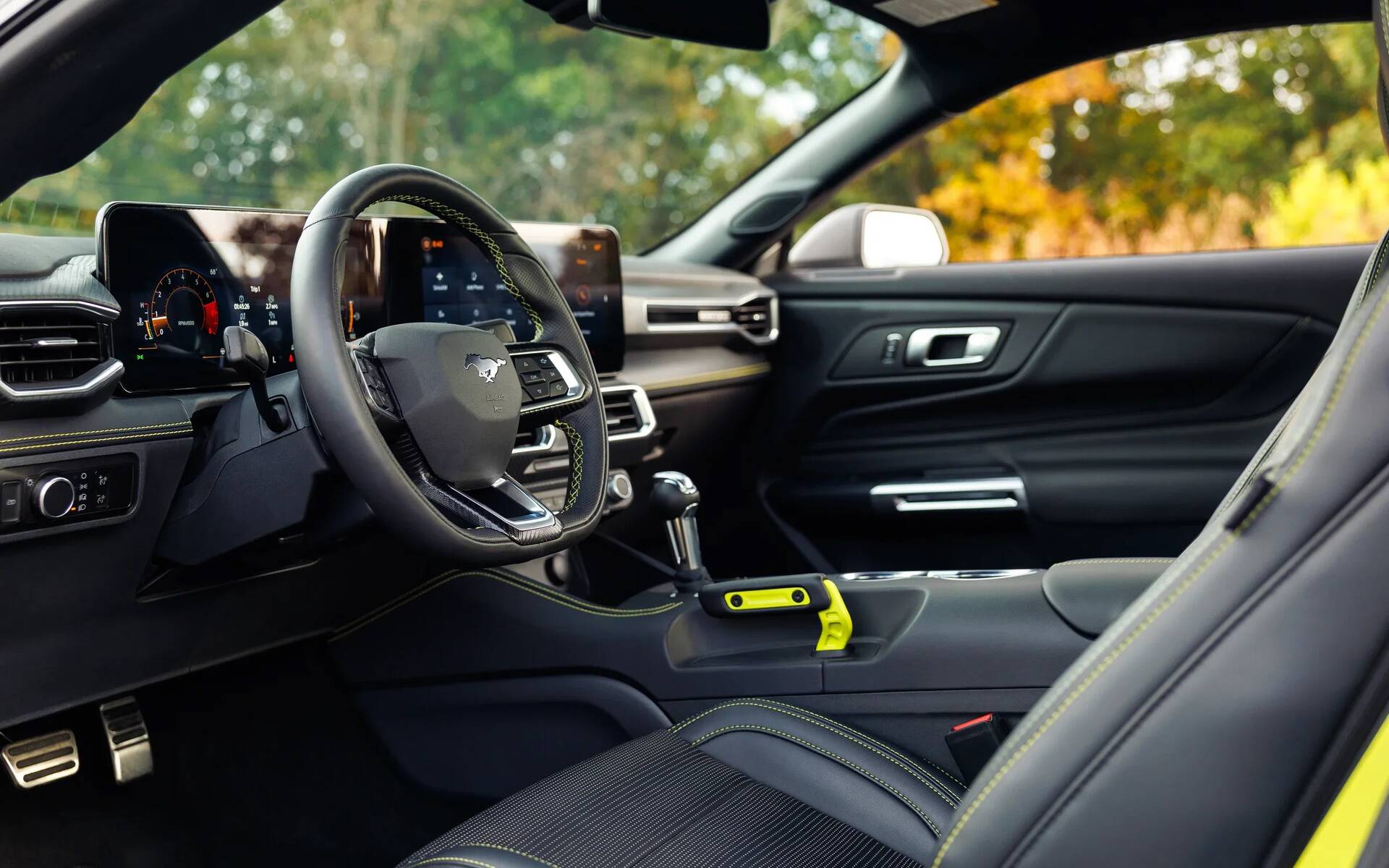 A new body colour, Avalanche Grey, joins the standard Mustang colour palette for 2026. Don’t miss the special RTR graphics on the hood, rocker and rear quarter panels, or the available Hyper Lime finish on the brake callipers that slow down the 19-inch wheels (with a 30mm offset).