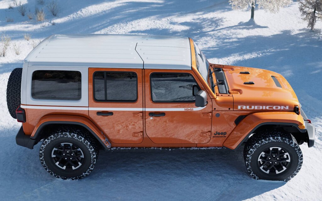 There’s also a Bright White 1941 side strip decal, plus a Bright White hood decal in Rubicon trim. A Sky One-Touch power top in Bright White accent is optional.