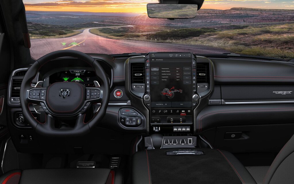 Inside, the 2027 Ram SRT TRX retains a familiar layout but adds visual flair and extra technology. Red contrast stitching flows across the hand-wrapped dashboard, door panels and centre console and is further complemented by red embroidered TRX seatback logos and TRX-exclusive Ruby Red seatbelts. The full suede headliner and suede-wrapped visors are borrowed from the luxurious Ram 1500 Tungsten.