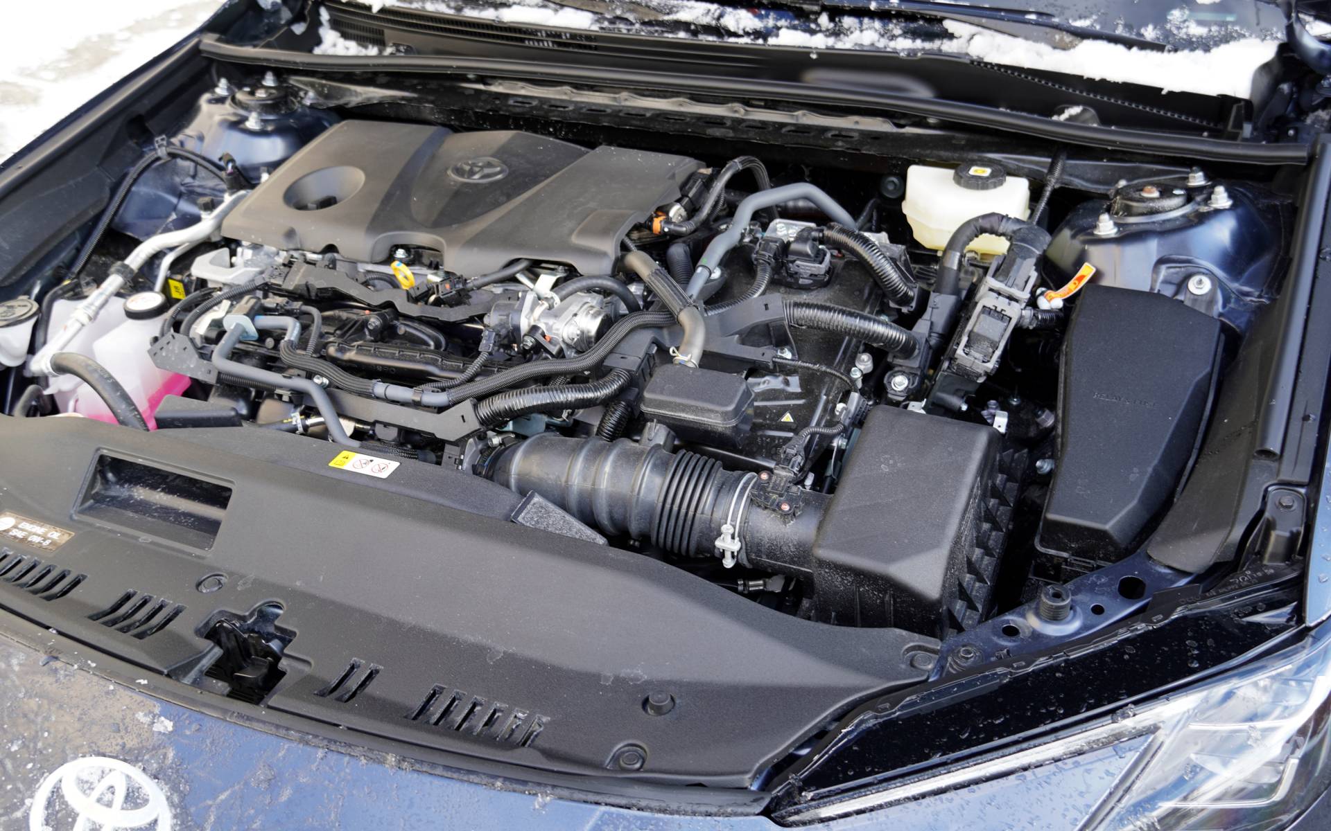 At the heart of the Camry XLE—equipped as standard with a third electric motor on the rear axle to provide all-wheel drive—is a hybrid powertrain that pairs a naturally aspirated 2.5-litre four-cylinder engine with three electric motors, a small battery pack and a continuously variable transmission.