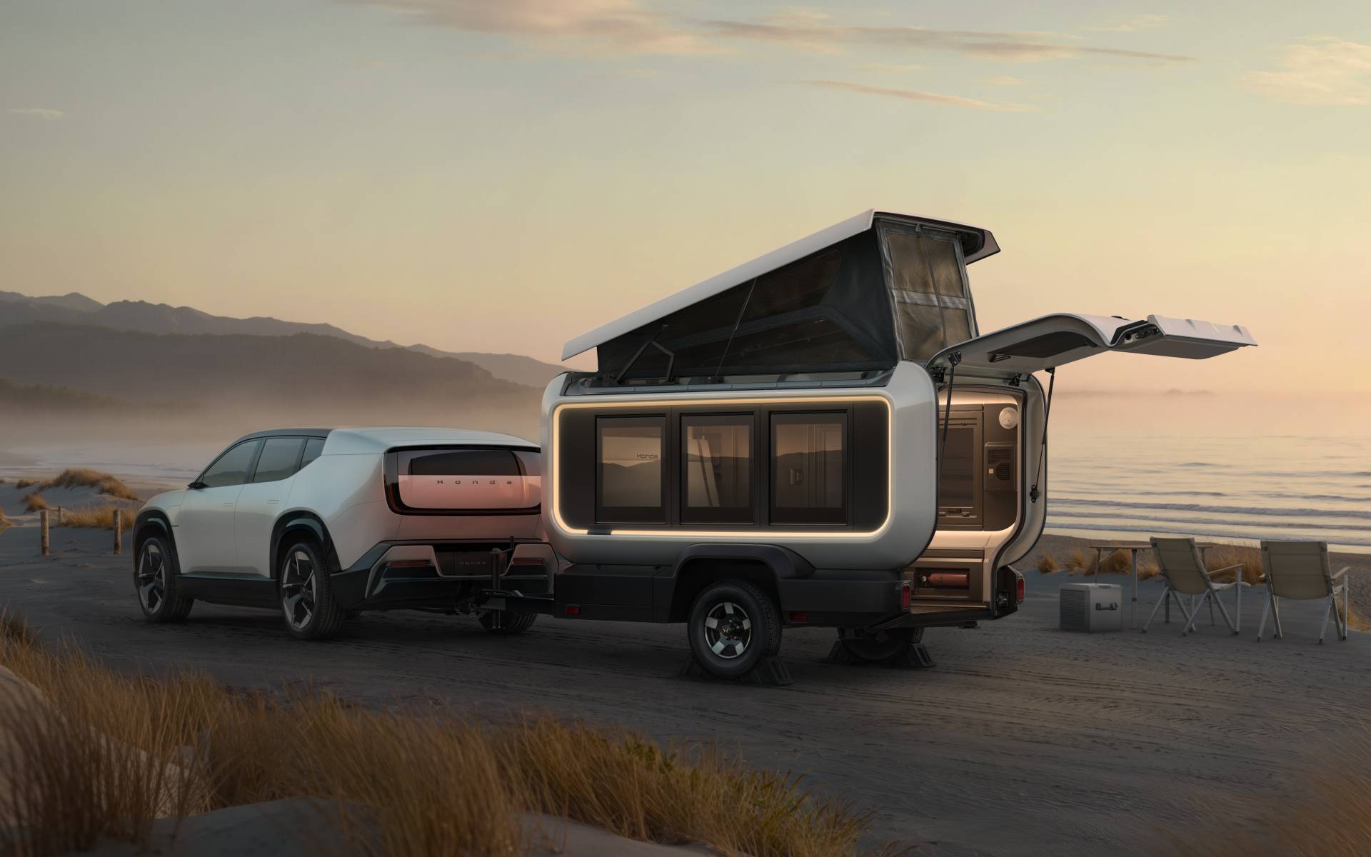 This lightweight and ultra-modular trailer can be towed by almost any vehicle, whether gas-powered or electric. It can also fit in a standard residential garage or parking space. The ambient light rings around the windows are not only programmable for brightness and colour, but will also illuminate a campsite to make setting up easy at night.