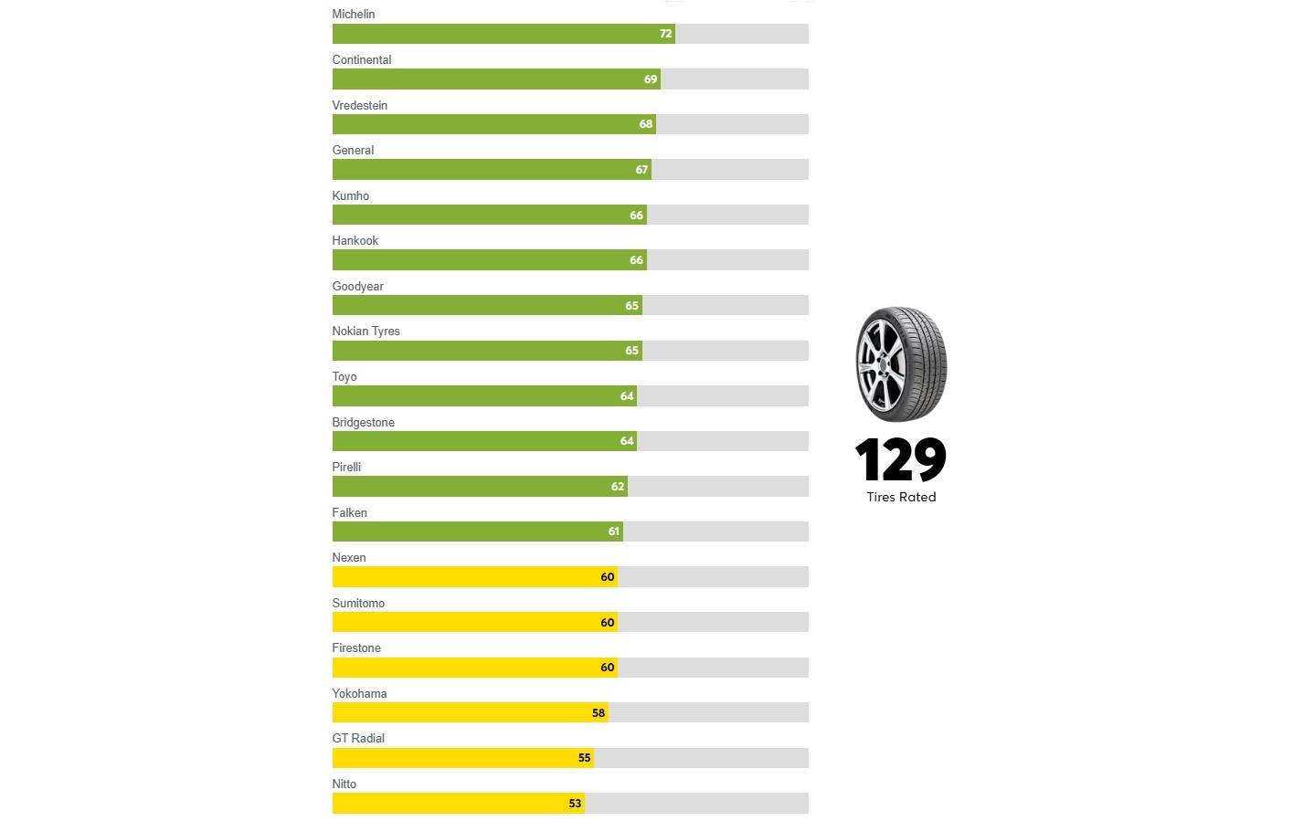 Another trusted source is definitely U.S. magazine Consumer Reports, which recently published the results of its extensive tests on 129 tire models from 30 brands covering nine different categories. The 18 brands with at least four models tested are included in the final ranking.