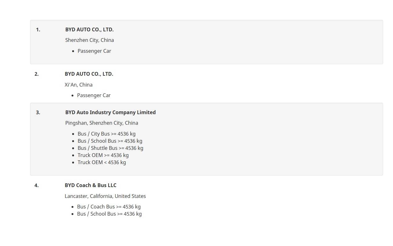 This includes BYD AUTO CO., LTD. for passenger vehicles manufactured at the Shenzhen and Xi'an plants, as well as BYD Auto Industry Company Limited and BYD Coach & Bus LLC for commercial vehicles (buses and trucks). The former produces models such as the Seagull, Dolphin, Seal and Atto, all likely to appeal to Canadian consumers with their affordable prices.