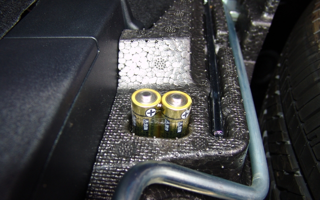 Lexus LS600h L 2011. Près du pneu de secours, on retrouve des batteries AA. C'est une voiture hybride après tout!