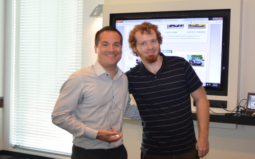 Benjamin Hunter, the Car Guide’s web editor presents Patrick St-Pierre with the 2013 award for the best convertible and roadster 50K-100K for the Porsche Boxster