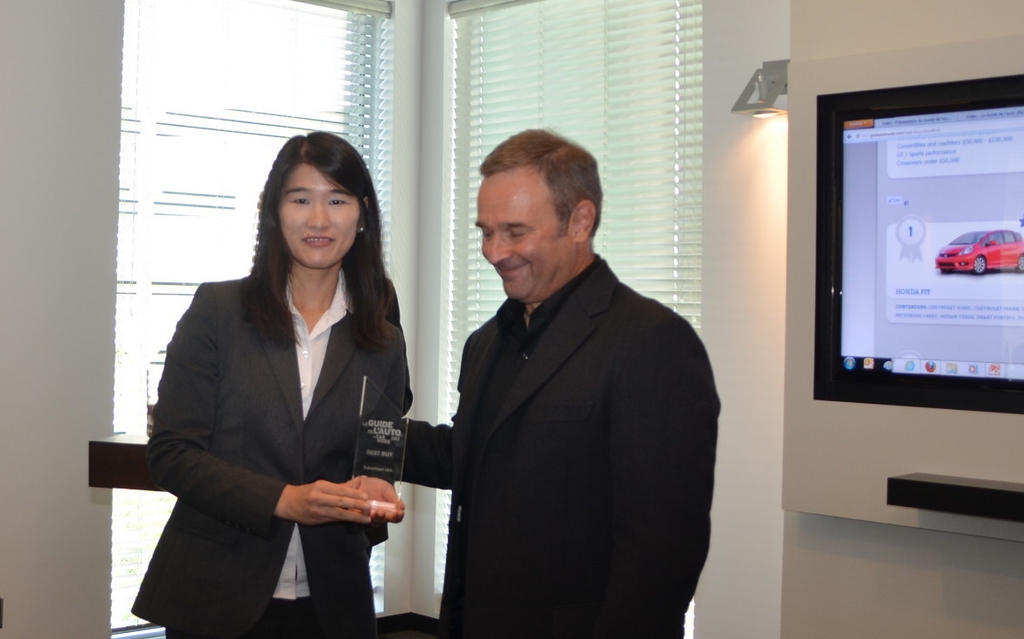 Marc Lachapelle presents to Maki Inoue, from Honda Canada, the 2013 award for the best sub-compact car for the Honda Fit