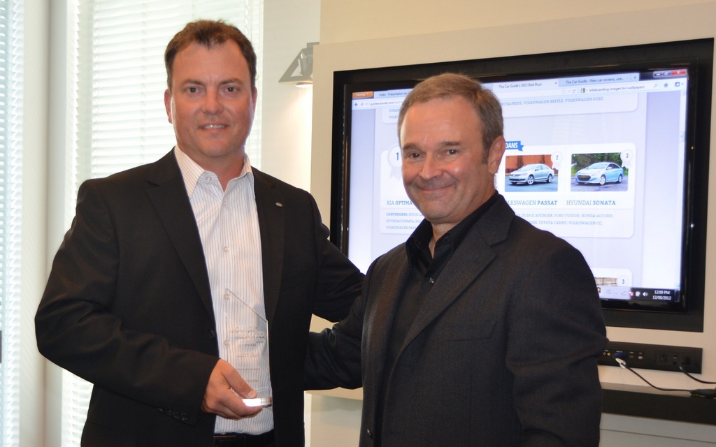 Jack Sulymka, Marc Lachapelle and the award for the best 2013 mid-size sedans, the Kia Optima