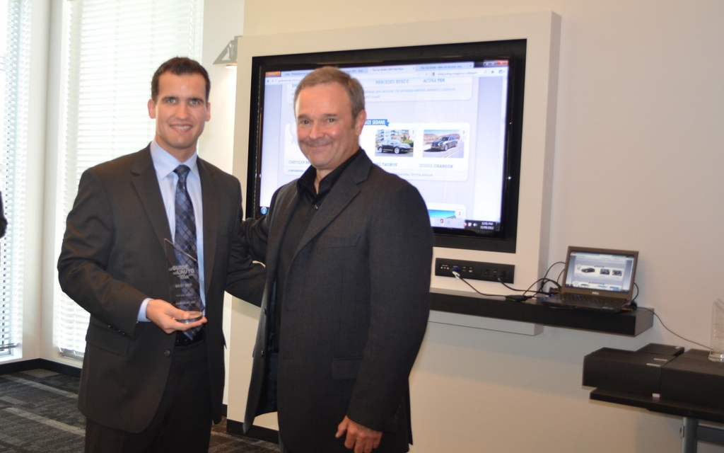 Marc Lachapelle presents Jordan Wasylyk with the 2013 best full-size sedan for the Chrysler 300