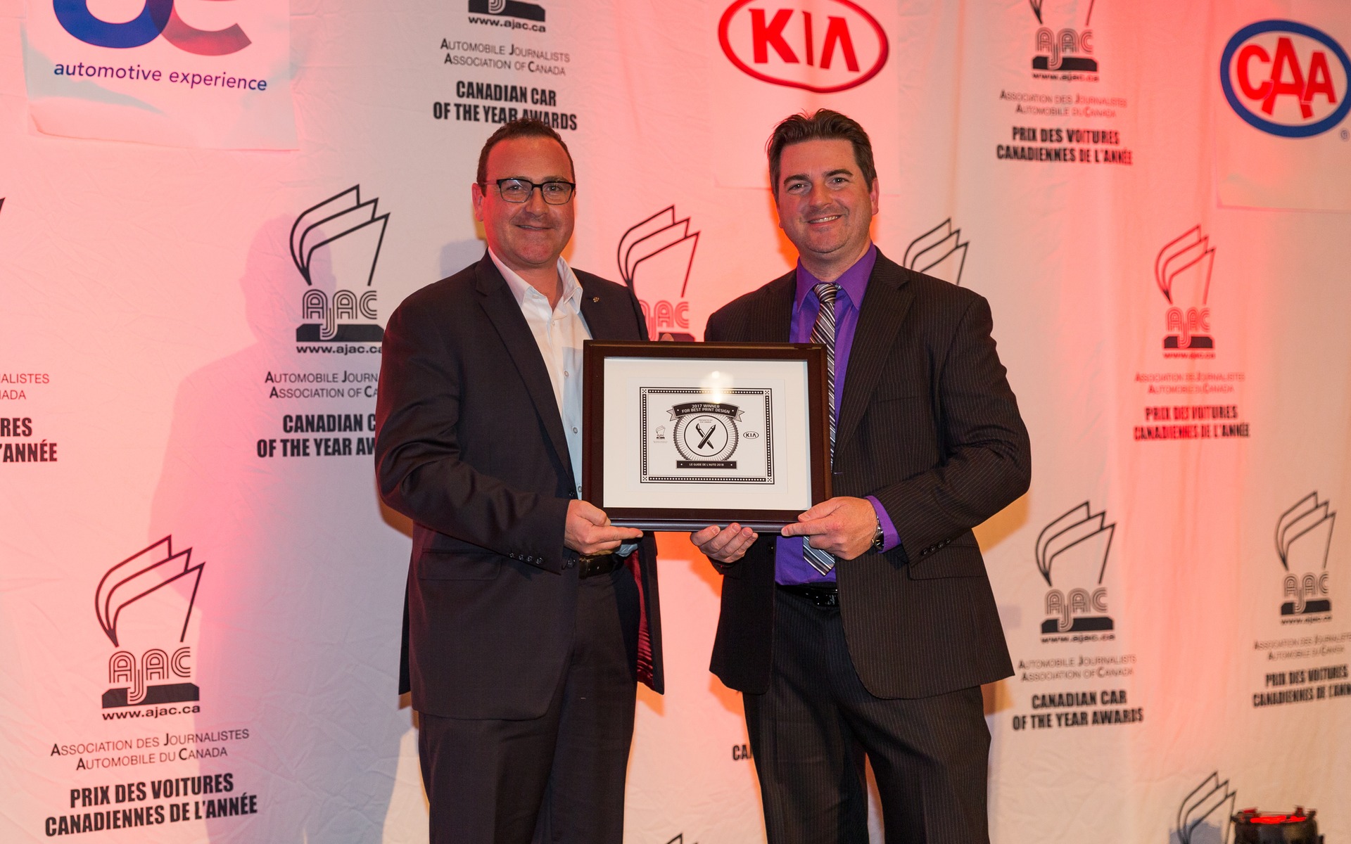 Best Print Design for Le Guide de l'auto 2018, Best Web Design for www.carguideweb.com and www.guideautoweb.com. On the left, Maxime Surette, public relations manager for Kia Canada, and on the right, Michel Deslauriers of The Car Guide.