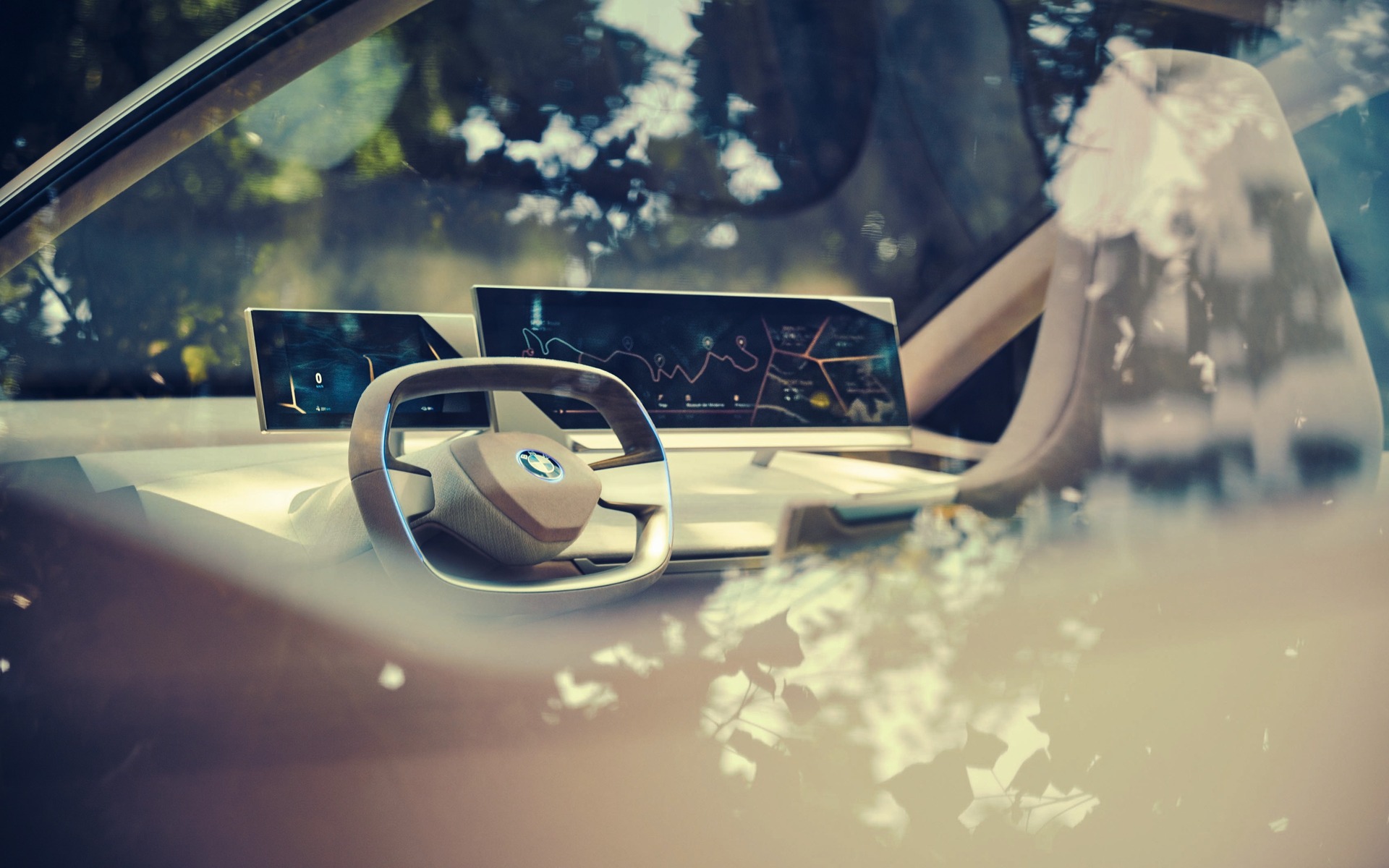 BMW Vision iNEXT Concept - The design of the cabin is reminiscent of a boutique hotel with minimalist styling to create a lounge-type atmosphere, with a mix of cloth and wood, and the seats are upholstered in jacquard fabric. Two screens are fitted to the dashboard and the Vision iNEXT Concept sports a square steering wheel, which recedes when the driver pushes on the BMW roundel to signal the transition to autonomous drive.