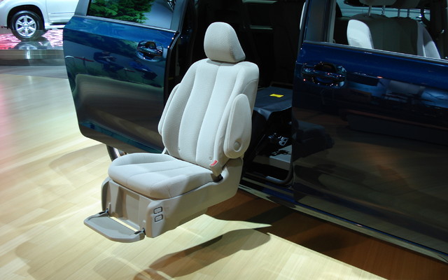 Toyota Sienna. Le véhicule n'est pas particulièrement intéressant mais l'Auto Access Seat est une merveille pour les gens petits ou souffrant d'arthrite, etc. Peut supporter jusqu'à 330 livres.