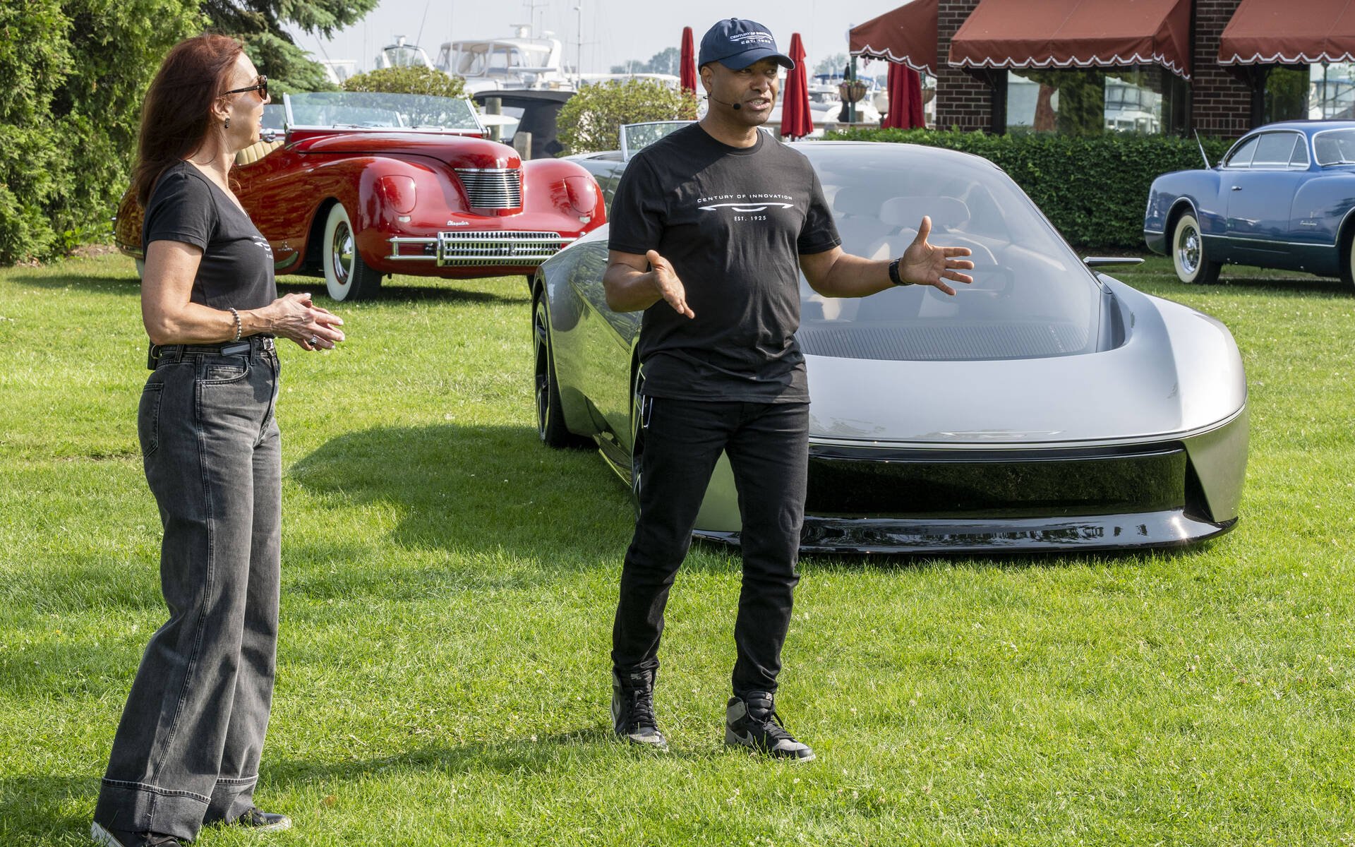 Chrysler Brand CEO Chris Feuell and Chief Design Officer Ralph Gilles in front of the 2024 Chrysler Halcyon Concept
