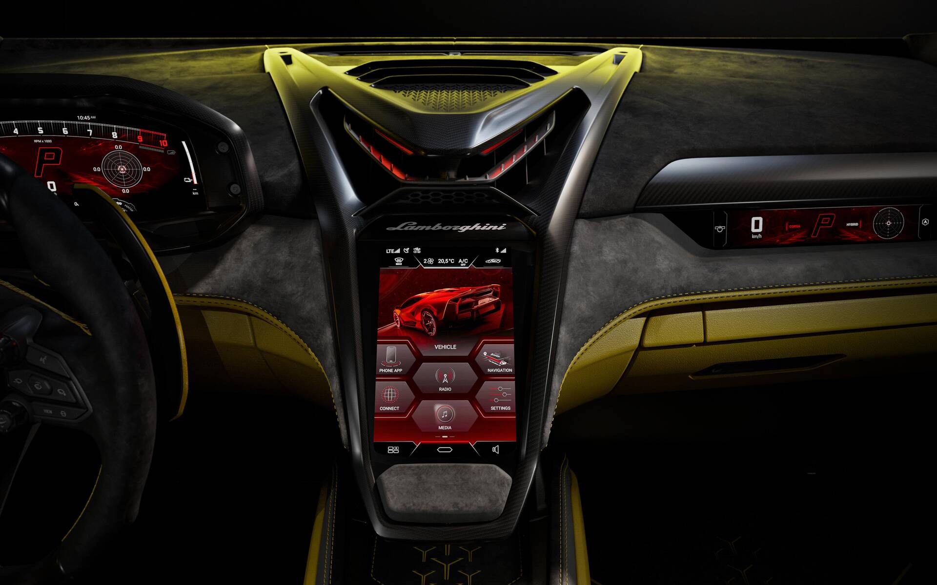 Carbon fibre is the primary material inside the Fenomeno, starting out with the centre console equipped with sport pad. Ambient lighting emphasizes the spaceship-like forms of the cabin.