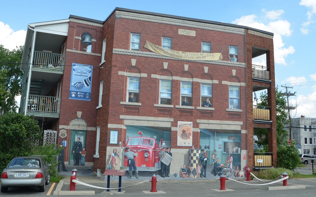 Pas évidente à trouver puisque sur le côté d'un édifice de la rue Marquette, cette murale est un hommage aux policiers et pompiers. En prime, un beau American Lafrance des années 1950.