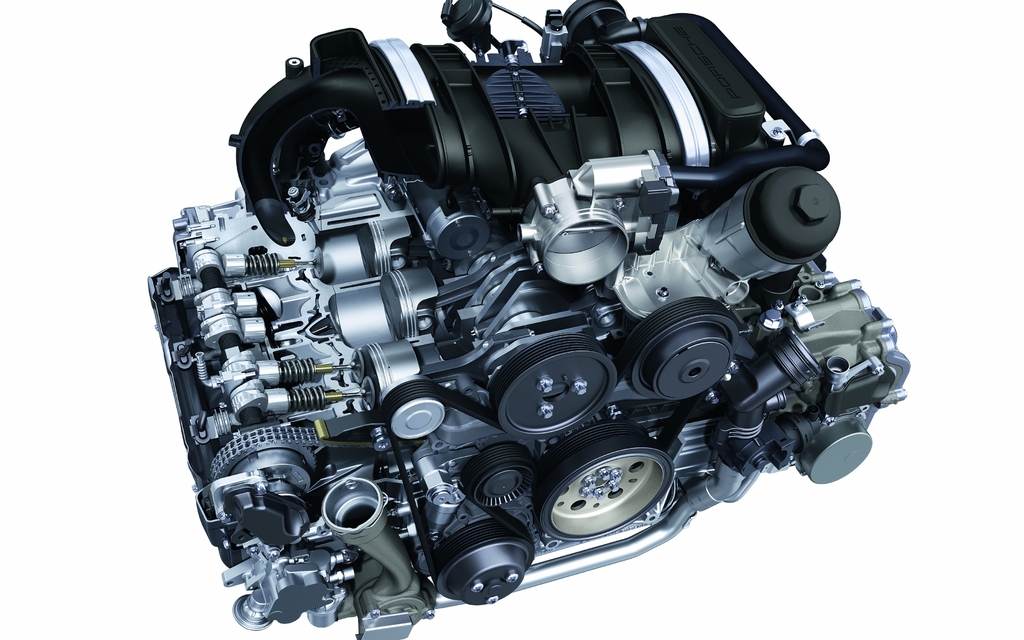 Le moteur "boxer" six cylindres à plat de 3,8 litres de la Porsche 911 Carrera S Cabrio 2012
