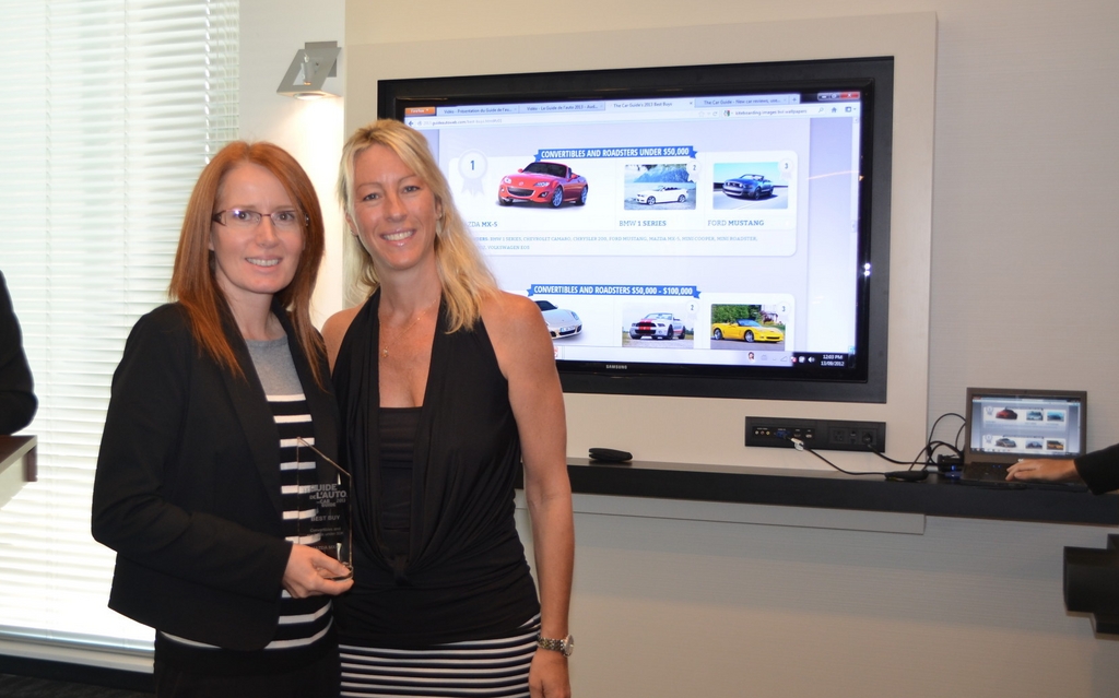 Nadine Filion remet le trophée du meilleur cabriolet et roadster à moins de 50 000$ à Sandra Lemaître de Mazda Canada.