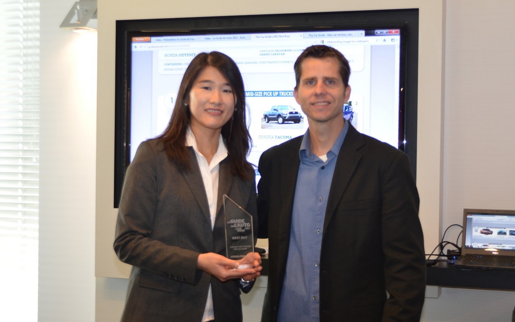 Sylvain Raymond remet le trophée de la meilleure camionnette intermédiaire à Maki Inoue de Honda Canada pour le Ridgeline.
