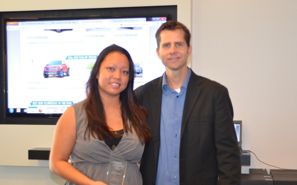 Le trophée de la meilleure grande camionnette est remis par Sylvain Raymond à Rosemarie Pao pour le F-150.