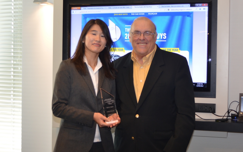 Maki Inoue de Honda Canada est fière de recevoir le prix du meilleur design de l'année pour la Acura NSX. Denis Duquet lui remet son prix.