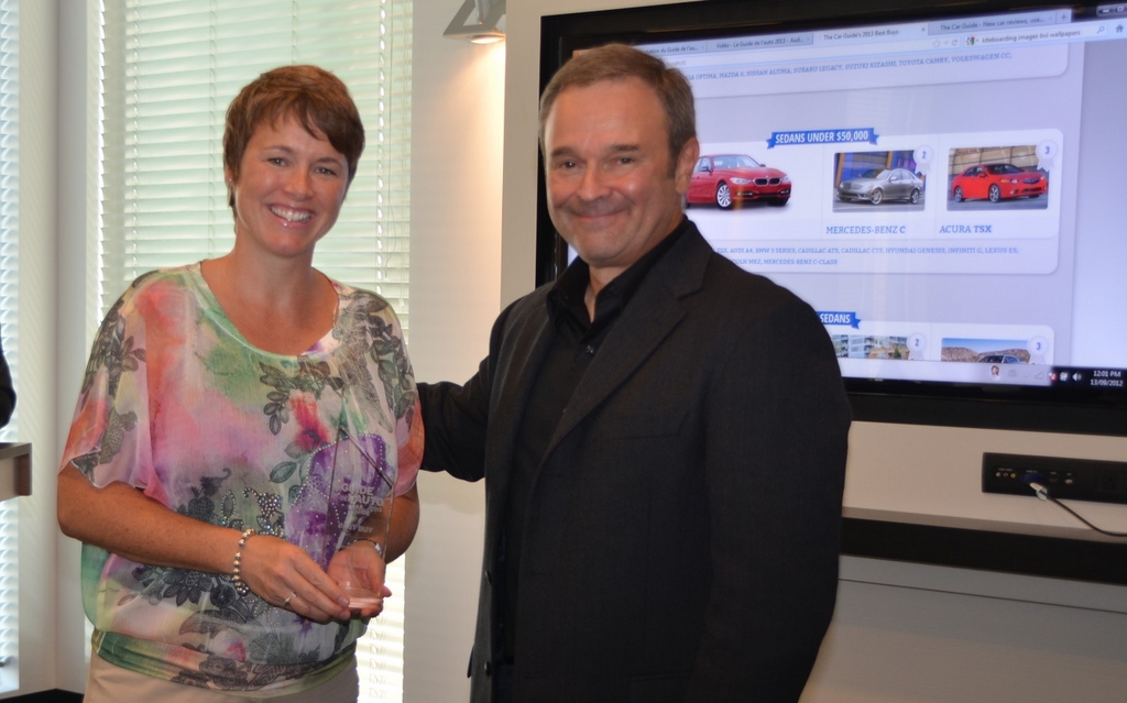Barbara Pitblado, de BMW Canada est venue chercher le trophée de la meilleure berline à moins de 50 000$, la Série 3. Elle est accompagnée de Marc Lachapelle.
