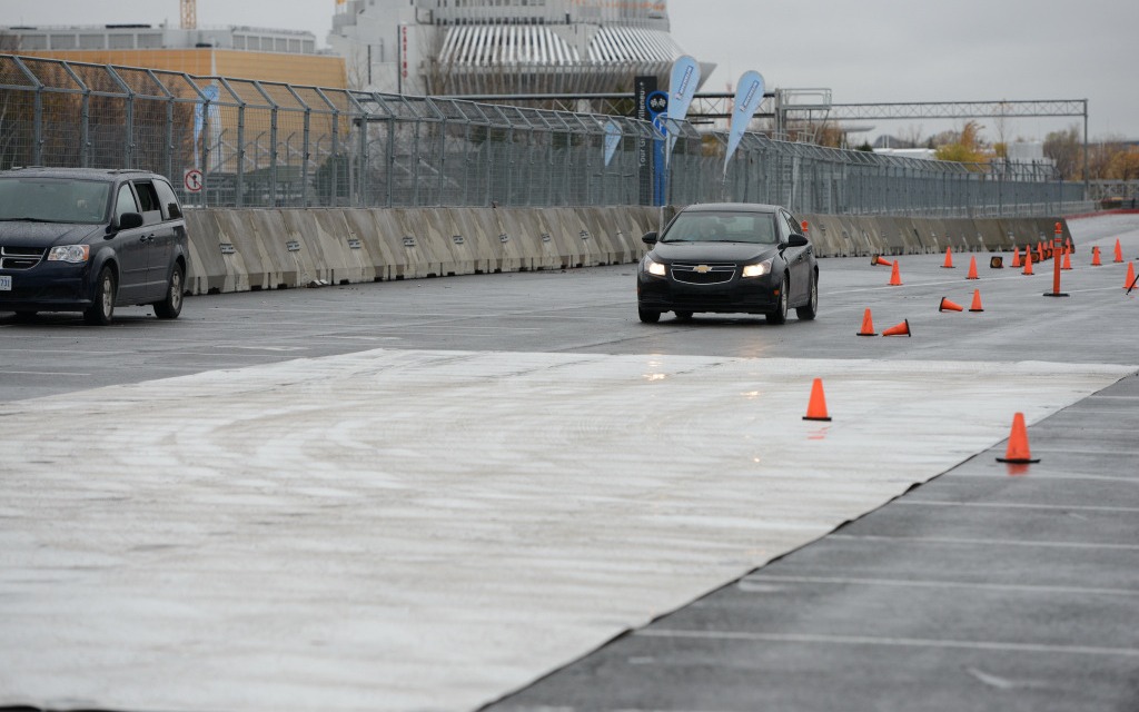 La toile blanche possède un très faible coefficient de friction, simulant une chaussée hivernale.