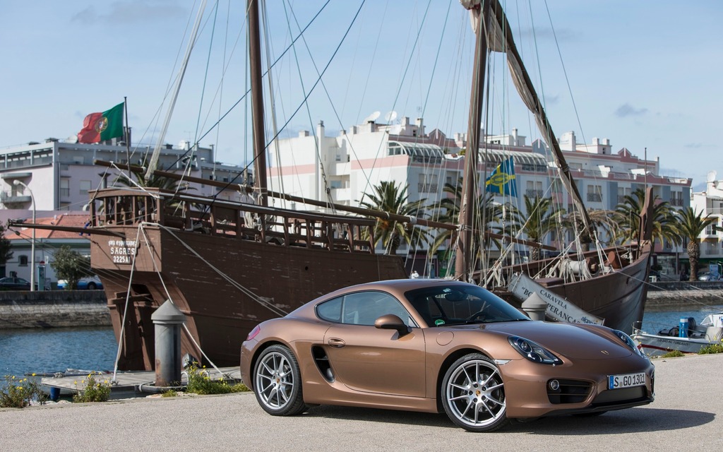 Porsche Cayman 2014 de couleur Cognac devant un petit port de mer au Portugal
