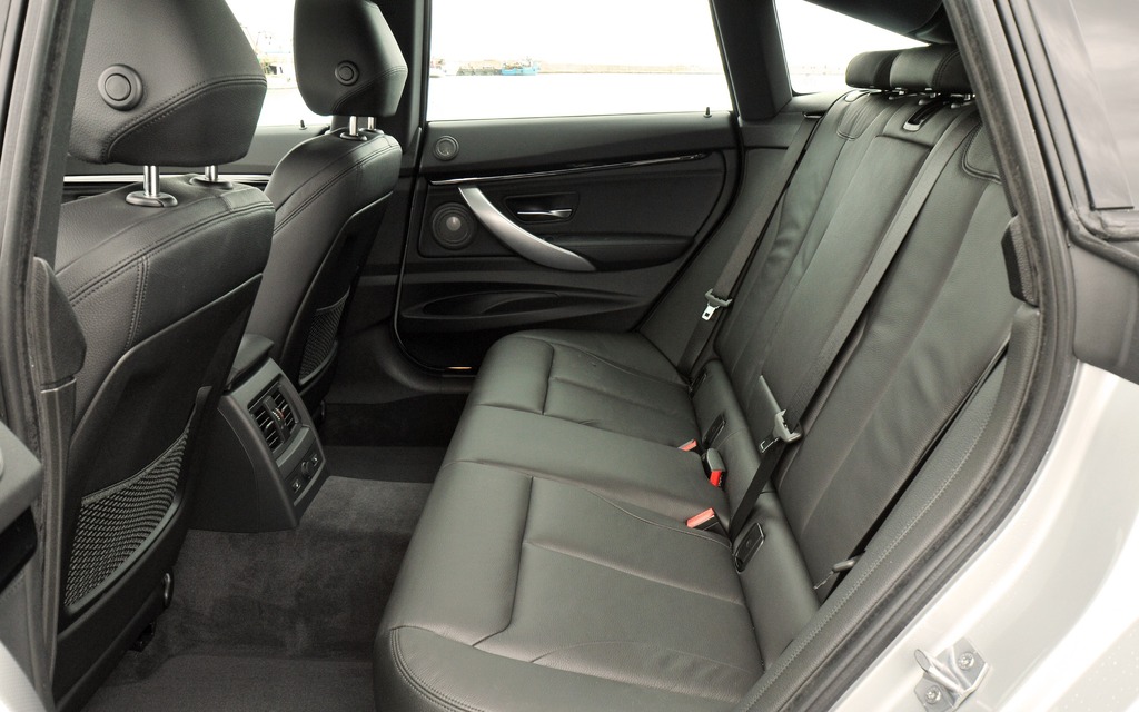 Les places arrière de la BMW Série 3 Gran Turismo 2014. Le dégagement pour les jambes se situe entre celui des BMW Série 5 et 7
