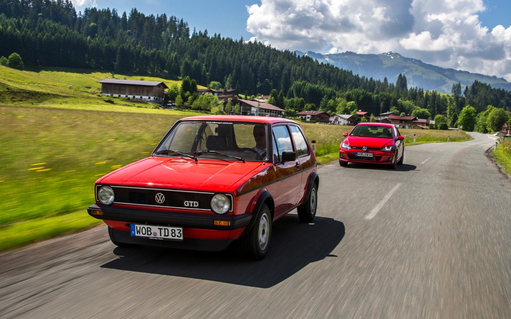 La toute première GTD (Mark 1 - 1982) devance le modèle actuel sur une route secondaire en Bavière