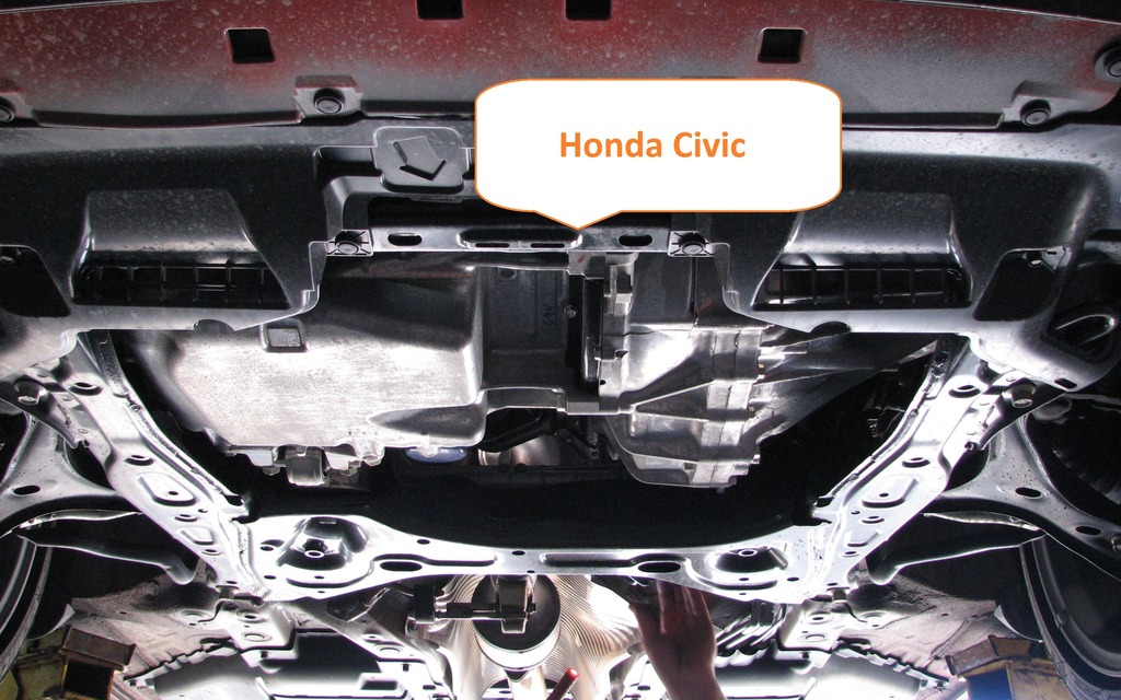 Sous la Civic, ce n'est pas le même constat. L'absence de plaque de plastique sous la motorisation révèle que le moteur de la Si, le 2,4 litres est plus volumineux que le 2,0 litres de l'ILX et nécessite également une meilleure ventilation pour le refroidir, ce que l'Acura ILX ne requiert pas de par sa vocation plus bourgeoise et moins sportive.