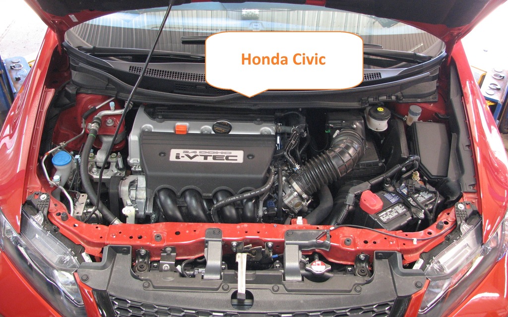 Les organes mécaniques de la Civic sont distribués de façon identique à ceux de l'Acura ILX. La Civic profite toutefois d'une motorisation de 2,4 litres qui prend un peu plus de place que le 2,0 litres de la ILX d'essai.