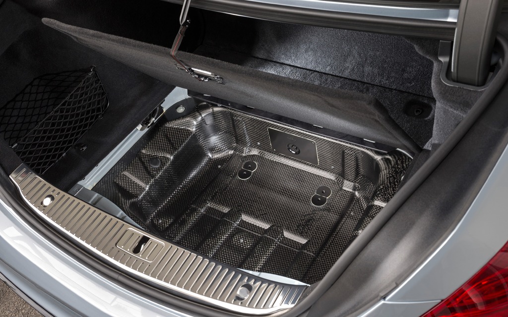 Mercedes-Benz S63 AMG 2014 - Compartiment de rangement de la roue de secours réalisé en fibre de carbone afin de réduire le poids.