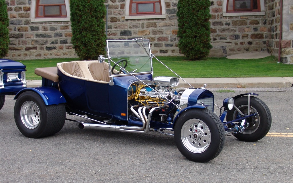 Deux places au grand air, pas de capot, pas d'ailes (ou si peu), un gros moteur, de grosses roues et un radiateur comme sur les Ford Model T, c'est ça un T-Bucket, une sorte de Hot Rod.