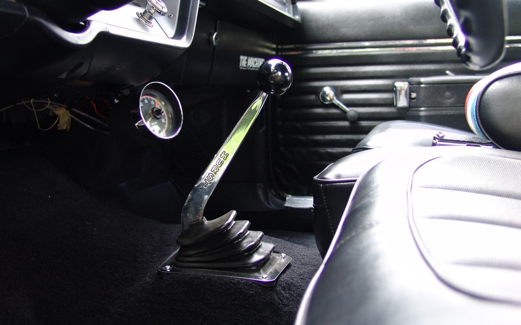 Hurst 4 vitesses. 1er rapport: 2.23 / 2 ième 1.77 / 3 ième 1.35 / 4 ième 1.00:1 / arrière 2.16:1.